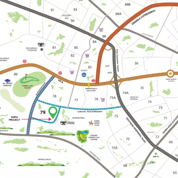 Strategically positioned near NH-48 and surrounded by established developments such as Bestech Altura, Antalya Hills, and Signature Global 79B, Aura Gurgaon ensures excellent connectivity to leading schools, hospitals, business hubs, and entertainment destinations—making it an ideal address for a balanced, luxurious, and wellness-driven lifestyle.